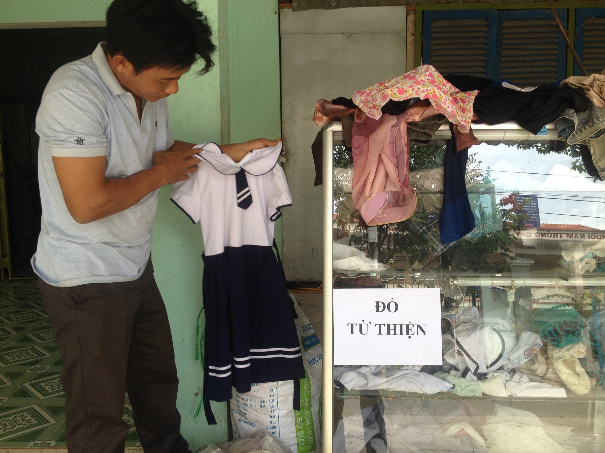 Ban đầu, vài bà con đi ngang nhà anh thấy dán trên tủ tờ giấy A4 ghi dòng chữ "Đồ từ thiện" mà không biết anh bán hay cho.