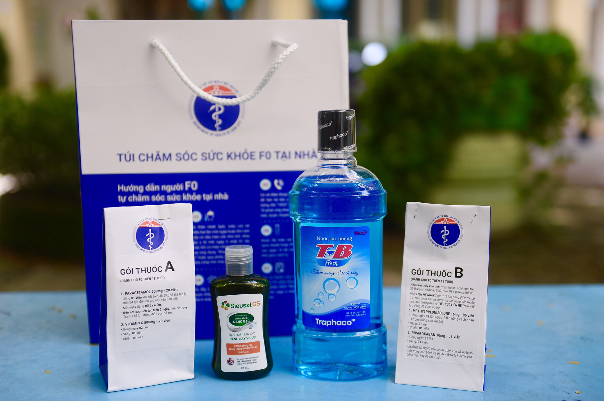 Cụ thể trong túi thuốc mà mỗi bệnh nhân F0 nhận được bao gồm Paracetamol 500g (10 viên), Acetylcystein (10 gói), MultiVitamin (10 viên), nước sát khuẩn hầu họng (1 lọ), nước muối 0.9% (Natri Clorid 0,9%), viên C sủi Uscadimin C1g (10 viên), khẩu trang. Kèm theo mỗi túi thuốc là phiếu hướng dẫn sử dụng cụ thể.